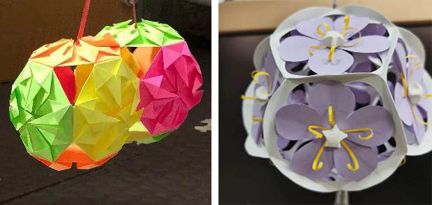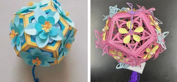 实体花球是用多个正多面体粘合而成,不是简单的相成,接着在正多面图形上进行装饰,如涂上鲜艳的色彩、各种剪纸。还可以进行手绘,手绘彩球是在各个面上创作图画。每一个面都不尽相同,随着彩球的每一次旋转,图画也不断变换,让人惊喜不已,也令人对另一个面的内容充满好奇,还值得细细品味。