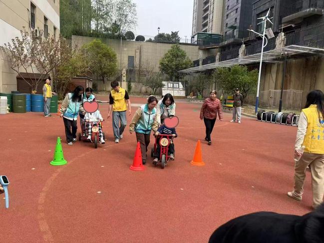 比赛进行时,家长、老师和志愿者们在场边给孩子们加油鼓气,呼喊声此起彼伏,孩子们和志愿者们一起进行了拔河游戏、套圈游戏、乒乓大作战、趴地圈圈等游戏,孩子们的参赛更像是沉浸式游戏,输赢从不是终点,每个孩子们始终践行着安全第一、比赛第二的原则。