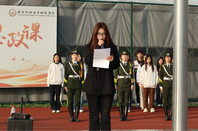 升旗仪式结束,教育科学公司党总支副书记胡芳老师以《聚焦两会精神·凝聚青春力量》为题,为栖霞校区师生讲授国旗下的思政课,她从“教育报国理想”“教学功底锤炼”“核心素养提升”三个维度展开,为未来教师成长锚定方向。她指出,今年两会提出的“加快建设高质量教育体系”与“弘扬教育家精神”,为师范生指明了奋斗路径,她援引习近平总书记对思政教育“大课堂”与“小课堂”融合的论述,号召师生以教育家精神为引领,将“四有好老师”标准刻入职业基因。针对数字化教育浪潮,她倡议开展“1+N阅读体系”与“三练三比”活动,主张同学们在传统与创新中夯实教学根基。胡芳老师号召同学们把两会精神转化为成长动力,以书卷气涵养师者风范,用创新力点燃课堂活力,在推进中国式教育现代化的征程中,书写属于师范生的青春答卷。