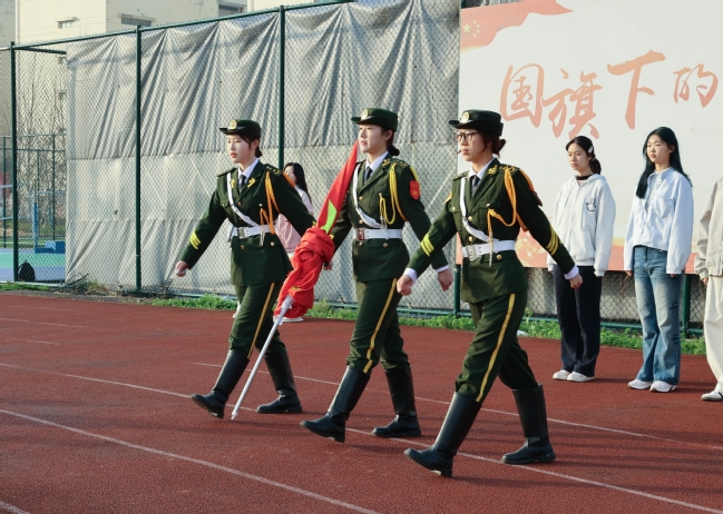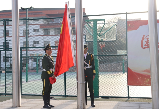 清晨,国旗护卫队迈着整齐有力的步伐,护送五星红旗走向升旗台。他们身姿挺拔,每一步都尽显坚定。伴随着雄壮的国歌声,五星红旗冉冉升起,现场师生肃立注目,齐唱国歌,心中满溢对祖国的热爱与自豪。