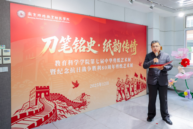 王立新董事长宣布开幕。他在讲话中指出,本次展览结合中国人民抗日战争暨世界反法西斯战争胜利80周年宏大主题,以刀为笔、以纸为媒,让展览的筹备过程成为一堂“课程思政”的特色实践。一幅幅作品,以无声的艺术语言,诉说着信仰的力量、和平的珍贵与师道的尊严,凝结了师生的智慧和创新,实现了专业学习与价值引领的同频共振,传承了“博爱塑魂”校训精神。希望全校上下牢记“国之大者”,继续弘扬伟大建党精神,自觉将中国共产党人精神谱系融入思政工作,为党育人、为国育才,为办好人民满意的特殊教育砥砺奋进。